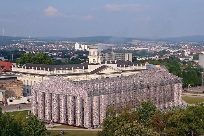 បើយោងទៅតាមប្រភពវិចិត្រករដដែលបញ្ជាក់ថា វាតំណាងឲ្យការប្រឆាំងតស៊ូនឹងការគាបសង្កត់ផ្នែកនយោបាយ។ ប្រាសាទសិប្បនិមិត្តនេះមានឈ្មោះ The Parthenon of Books ត្រូវបានបង្កើតនៅទីក្រុង Kassel ប្រទេសអាល្លឺម៉ង់។