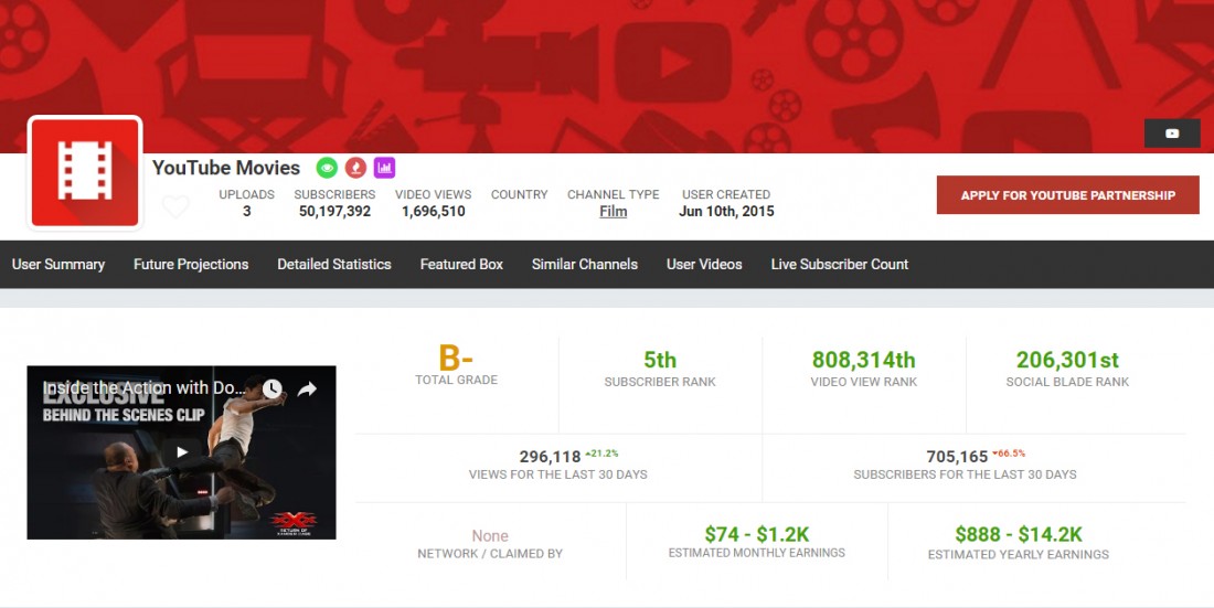 ដោយឡែកគណនីដ៏ពិសេស និងចម្លែកមួយឈ្មោះ YouTube Movies មានអ្នក Subscriber ដល់ទៅជាង ៥០ លាននាក់ ស្របពេលដែលគណនីនេះមានបង្ហោះវីដេអូតែ ៣ ប៉ុណ្ណោះ។